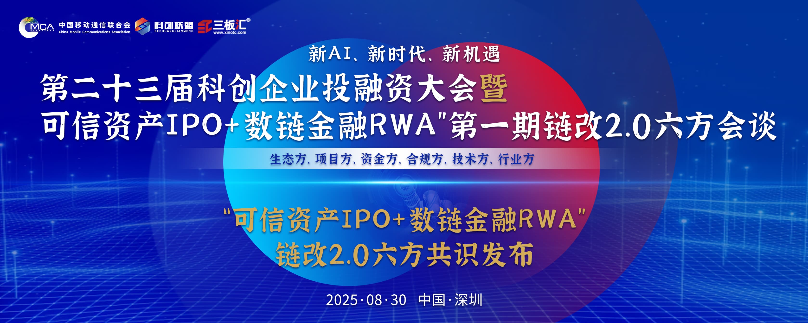 (央链直播报道) 2025年8月29-30日,第二十三届中国科创企业投融资大会将在深圳雅邦朗悦国际酒店隆重举行。作为本次大会的核心亮点,"可信资产IPO+数链金融RWA"首期链改2.0六方会谈将于8月30日下午重磅登场,同期还将举办2025元宇宙AI数据要素"金杏奖"全国大赛晋级复赛仪式,汇聚政产学研金多方力量,共同探索科技创新与资本融合的新路径,擘画数字经济高质量发展的宏伟蓝图。