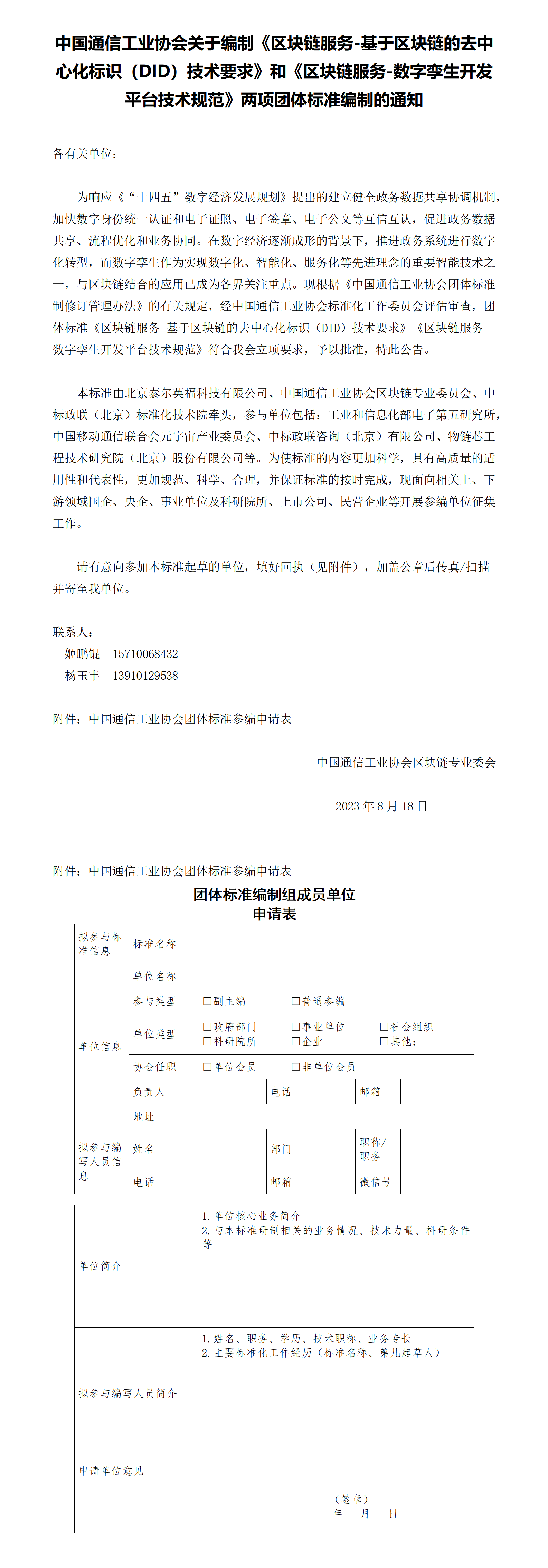 中国通信工业协会关于编制《区块链服务-基于区块链的去中心化标识(DID)技术要求》和《区块链服务-数字孪生开发平台技术规范》两项团体标准编制的通知