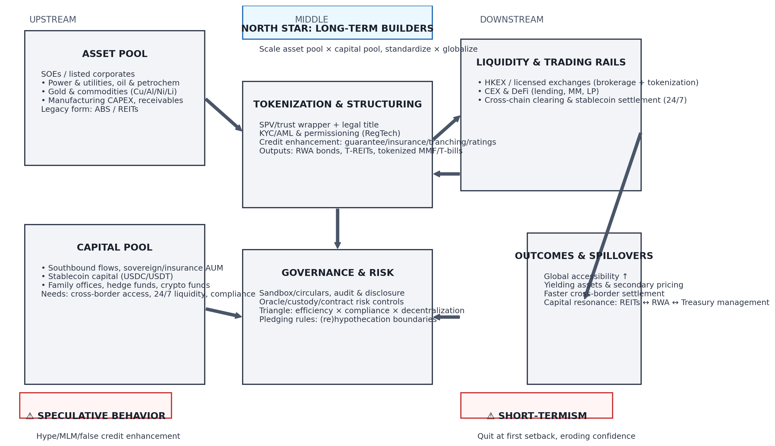 解决问题的关键在于做大资产池和资金池。这不仅需要来自传统金融的参与,尤其是成熟的机构市场和固收融资市场,这已经有成熟的资产端、承做、承销和资金端。同时,还需要依托香港的特殊地位,吸引来自中国及全球的大型企业、国企和央企的资产。这些大规模的资产,能够为RWA市场带来稳定的现金流和资产基础,进而打破当前市场的融资困境。